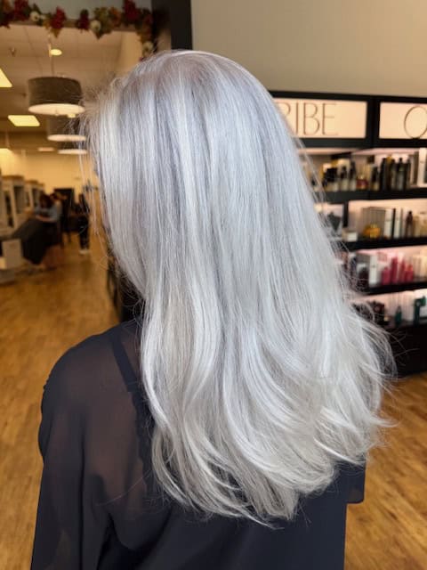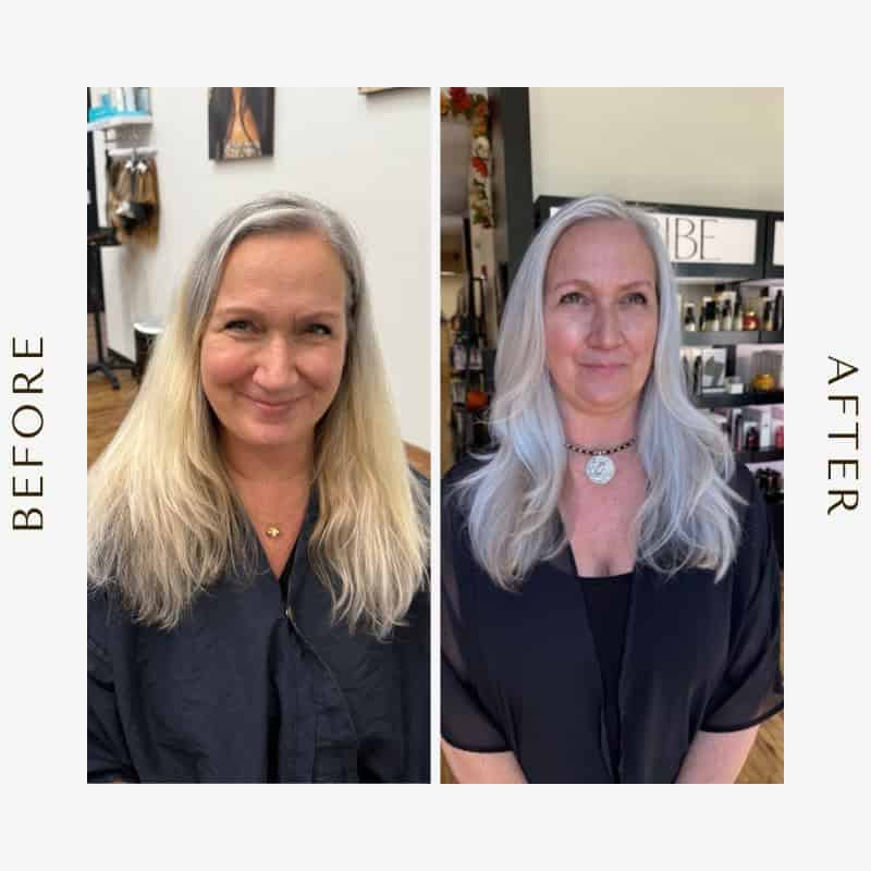 This was more than a simple touch-up — it was a professional color service designed to blend Lisa’s existing blonde with her new silver tones, creating a seamless, elegant result. Charlene shared that these transformations require artistry and care to protect the hair’s integrity while achieving a luminous, modern finish.
